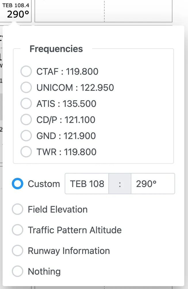A user requested nav aids to be added to the Airport tile. The idea is to display the bearing leading to the airport for a given VOR. While we are not listing navigation aids in corner fields today, you can achieve the same result with custom corner values. In the example below, bottom left and bottom right are custom values showing the desired data fields: