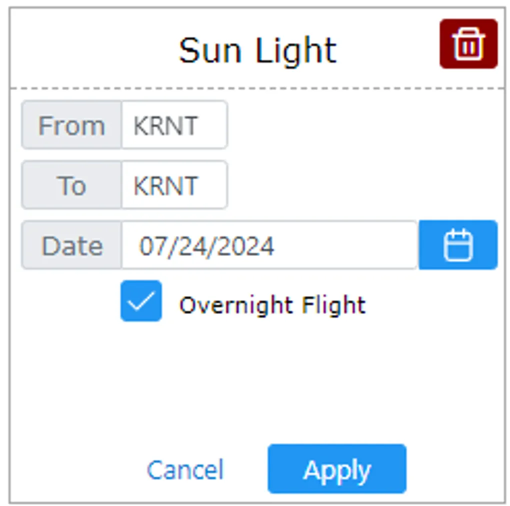 The “Sunlight” Tile now has a “Night Flight” mode which comes in handy when you fly in the evening or land before sunrise. It can be activated by selecting the “Overnight flight” checkbox in Sunlight tile settings.
