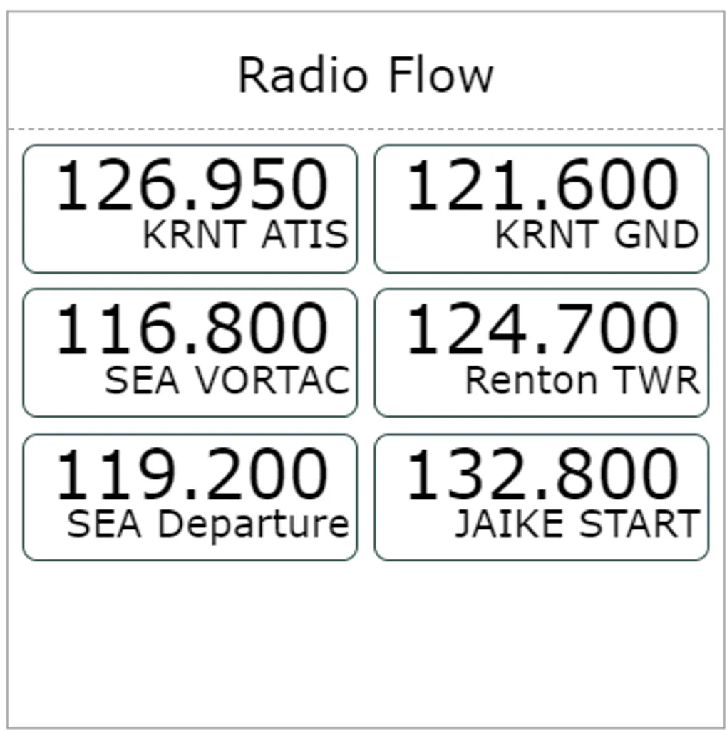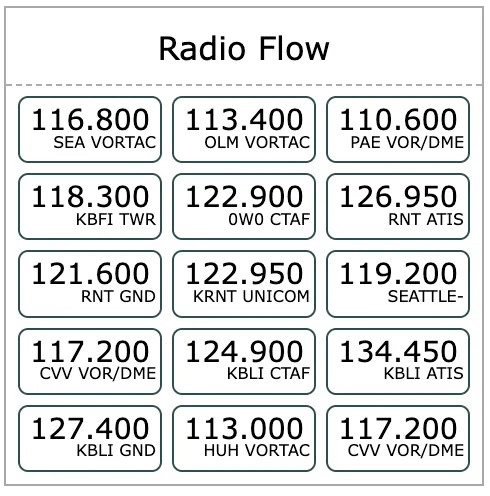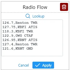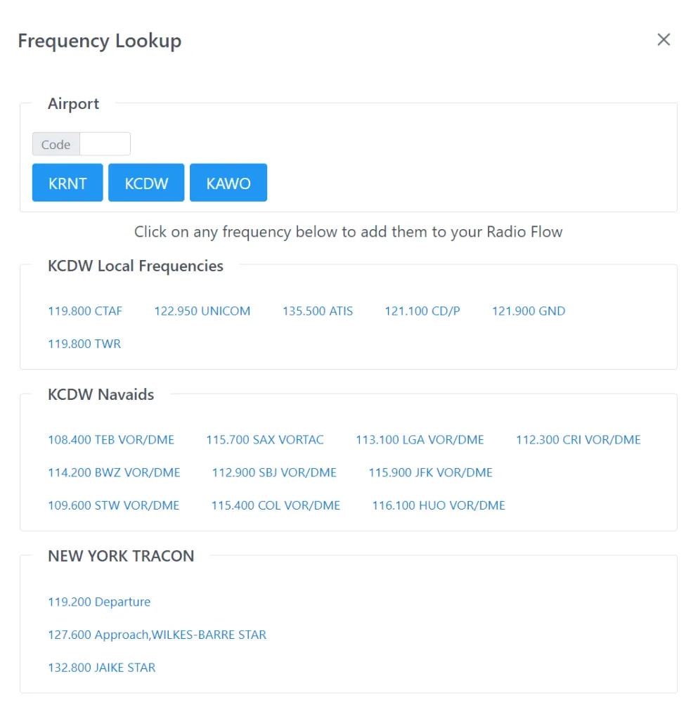 Next, you can click any frequency below the airport, which will be added to your Radio Flow. Click as many frequencies as you need, while keeping an eye on the total count, then go back to the list by clicking ‘Done’. If you have a doubt about a particular frequency, just mouse over to see its details.