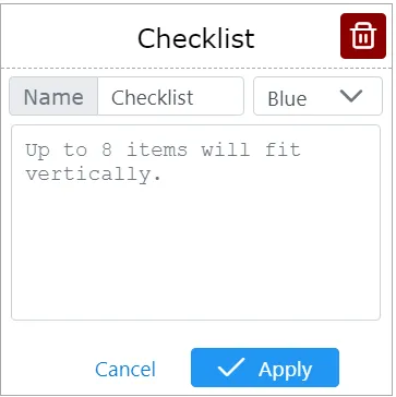 When choosing a new tile type, you now have 8 choices. Just pick “Checklist”. It will start in its empty state but you can add items by clicking the header. The format is identical from the bigger checklist. Use demo checklist tile/page for inspiration.