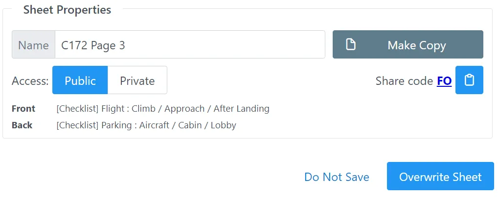 Sharing mechanism is the same via Save > Access > Public, and you have the same code to show for it. Except now you also have a link, which is basically GA Kneeboard URL along with the sheet code. On the right, below the “Make Copy” button, you can see your share code, a link and a clipboard button. Click that button to copy the link to the clipboard.