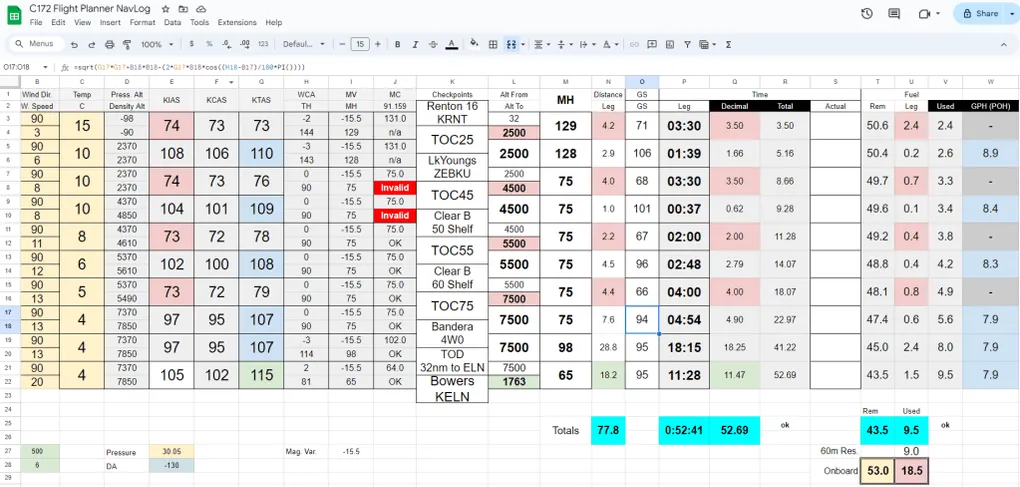 Like all PPL students, I had to digest the Navlog creation process with mixed results. The process felt inefficient, inaccurate and quite repetitive. At the same time, there is clear value in having the flight mapped in your head and it acts as a forcing function to figure out the expected weather along the way. After many iterations with various paper formats, I ended up with a useful Google spreadsheet that had most fields automated