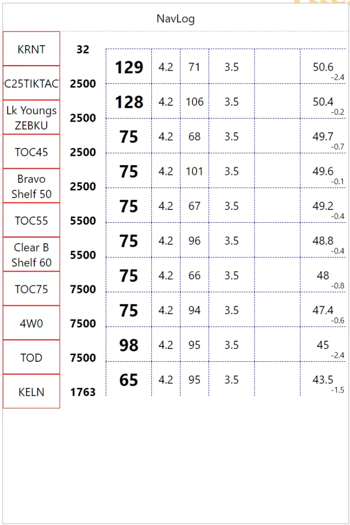 In this version, I am experimenting with last column offset. My thinking goes time and fuel are checked at checkpoints so they should be aligned. The result looks a little weird so I go back to my senses (on the right). In the process, I am not flipping Fuel Remaining and Leg Fuel. So the top right blue fuel value is full tank. We also have totals at the bottom for Distance, Time and Fuel (Remaining).
