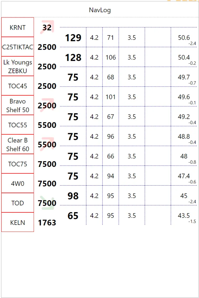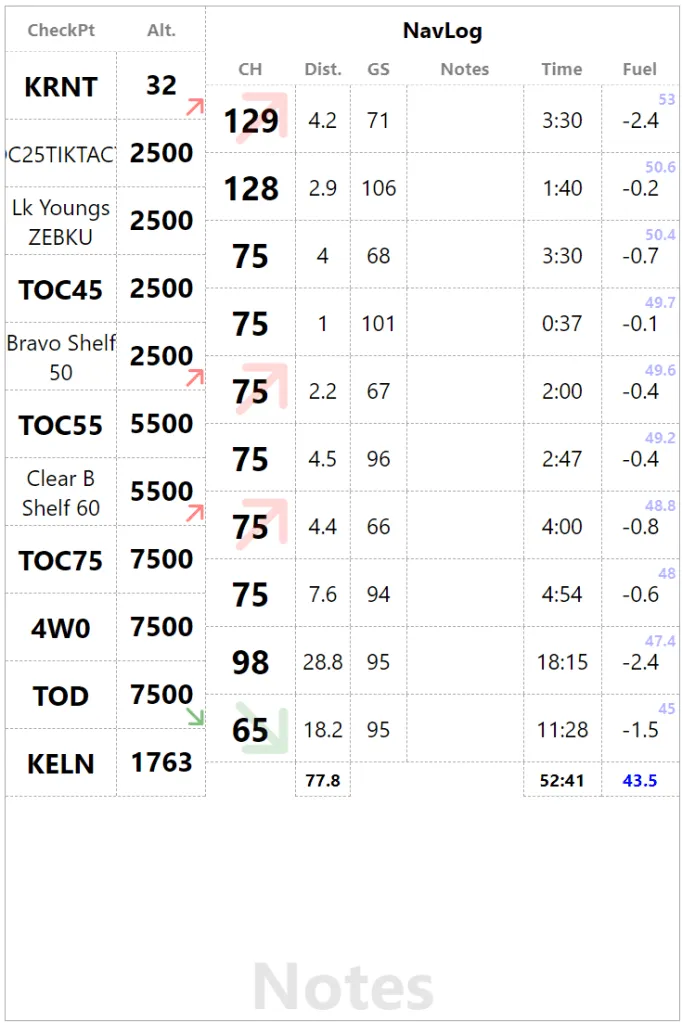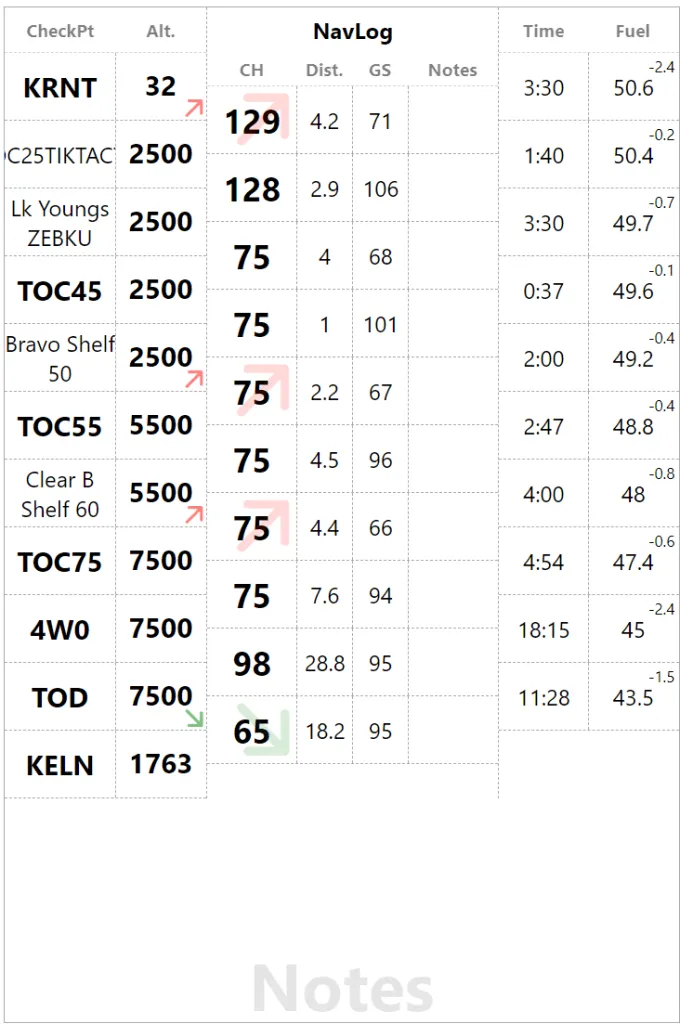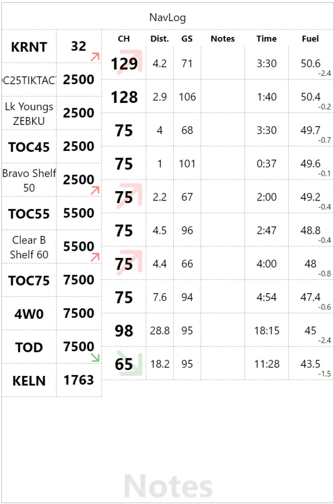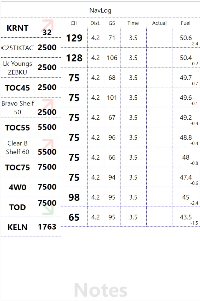 We are not enhancing the checkpoints, with a bolder font on short names and a big arrow to indicate changes in phases of flight in the altitude field. Red=Climb, Green=Descent. We are offsetting altitude value top of down to improve arrow visibility but it doesn’t look that good. So back to vertically centered with the text and now we have a big arrow in the heading and a small reminder in the altitude bottom right corner. We are also using more realistic values to distance to check the visual flow. In the process, the “Actual” column become “Notes” since I actually use it for fuel or time, we might as well make it generic.
