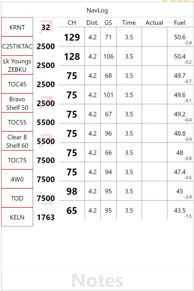 There are many data field one would want. For example, the last column will be used for fuel data which can be ‘Remaining Fuel’, ‘Leg Fuel’ or ‘Total Used Fuel’. Eventually these should be configurable since everybody has their own perfect format. We are experimenting with ‘Remaining Fuel’ as the main value and ‘Leg Fuel’ in the bottom right corner. I actually printed that version to check the small numbers were actually usable. Next we had column headers to disambiguate the data and a big ‘Notes’ watermark at the bottom to make the most of that space.