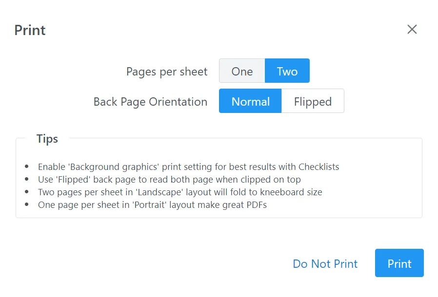 Since we can now create templates of more than 2 pages (such as this), we needed a feature to print efficiently. Our new print dialog allows you to print the template in one go with two options : 1) Pages per sheet and 2) Back Page Orientation. By default, if you want to print and clip a piece of paper to your kneeboard, Two pages and Flipped is your best choice, For checklists or anything with lateral binding, two pages and Normal should give you best results. Finally, if you want to create a PDF for Foreflight, we recommend one page, no margin and try different scale settings.