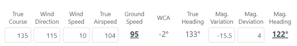 Navlog leg editor is getting smarter today with the addition of a calculator in leg editor. This utility is meant to consider winds in ground speed and magnetic headings. Its use is similar to an electronic EFB. Enter your True Course, Wind and True Airspeed to get a Ground Speed and a Wind Correction Angle. If you add Magnetic Variation and Magnetic Deviation, you also get a Magnetic Heading.