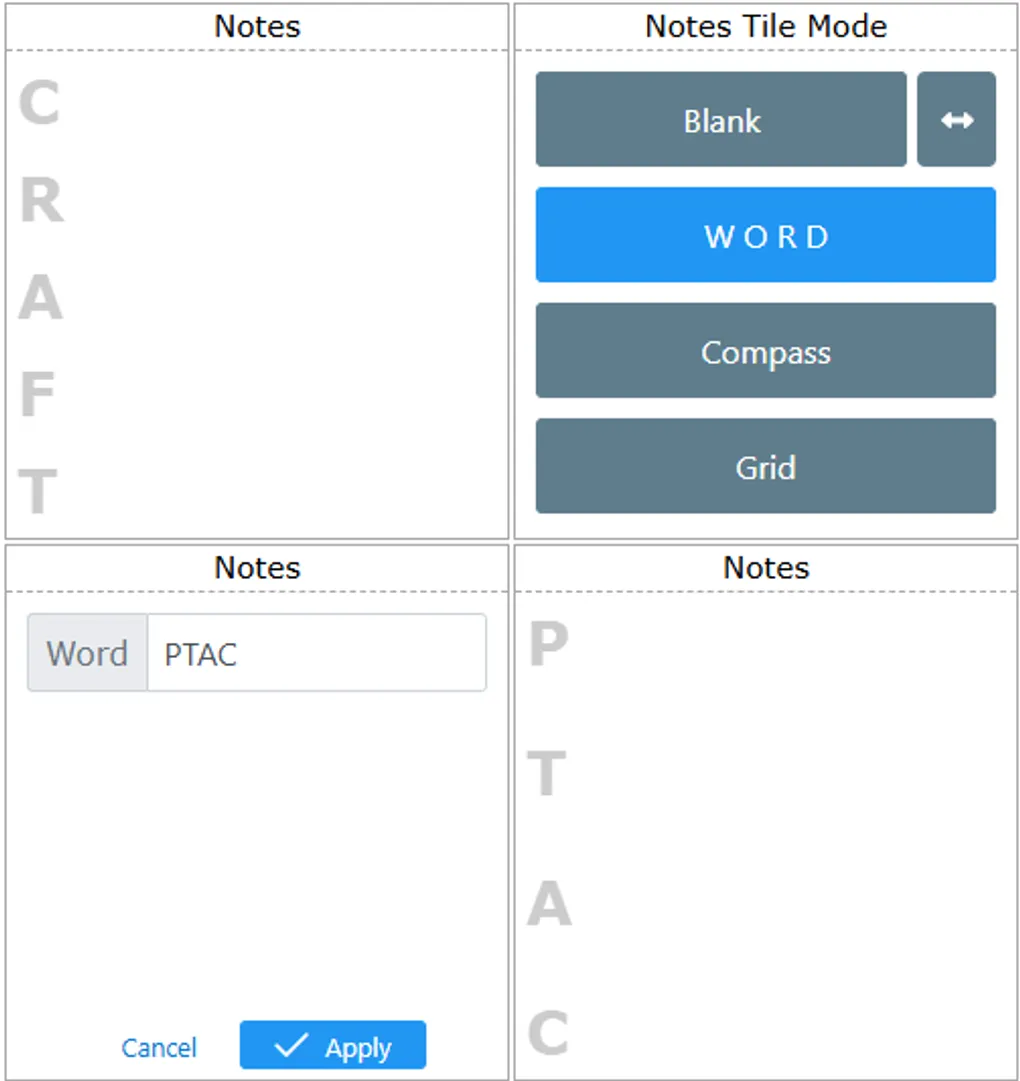 Solid batch of new things today, starting with the Note Tile where you can now configure any word you want instead of “CRAFT”. In the four images below 1) By default you should still see ‘CRAFT’, 2) Change the display mode to “WORD” 3) Type anything you need and 4) Voila, PTAC is the new watermark