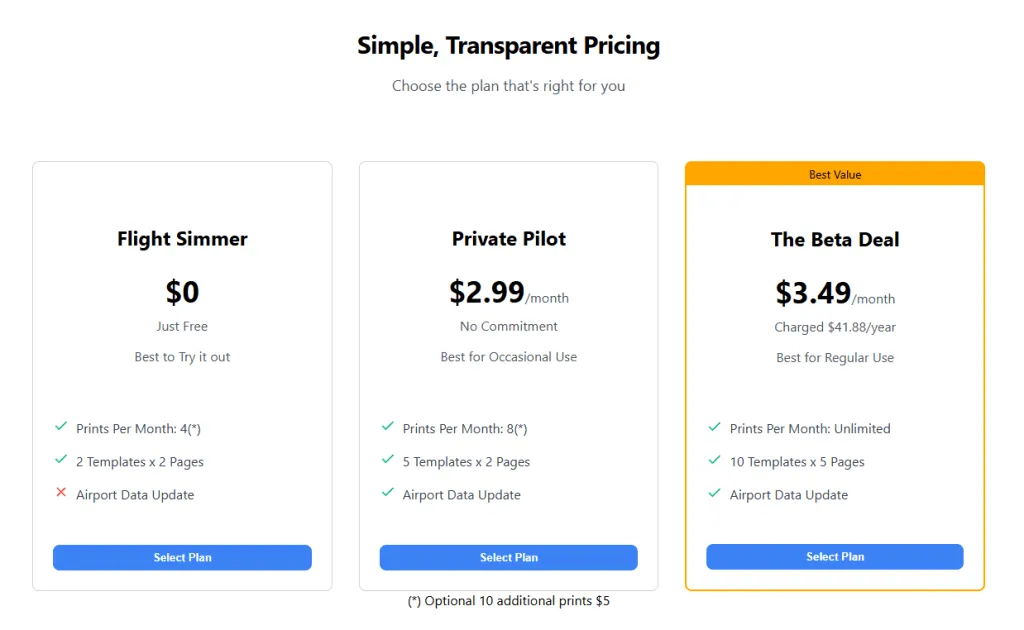 Subscriptions are available! Yes, you can finally set the record straight by subscribing to one of our plans. At $2.99 a month, you spend 6 times as much on taxi fuel every flight. Check out plans for out current deals. Heads up : The Beta Deal will not stick around for too long.