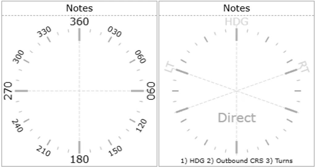 You can now choose between headings and holds in Notes tile compass mode the compass mode. Holds is use by writing you current heading on top, then draw turn separator LT for left turn and RE. Your outbound course will be in the correct quadrant.