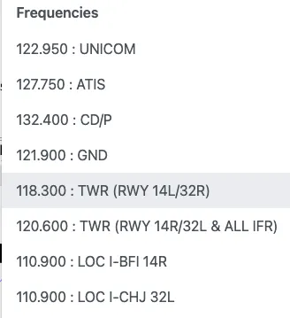 Further, we have improved Tower Frequency selection in the Airport Tile. For example at KBFI, we would disambiguate between both tower frequencies with the following notes (see RWY 14L/32R)