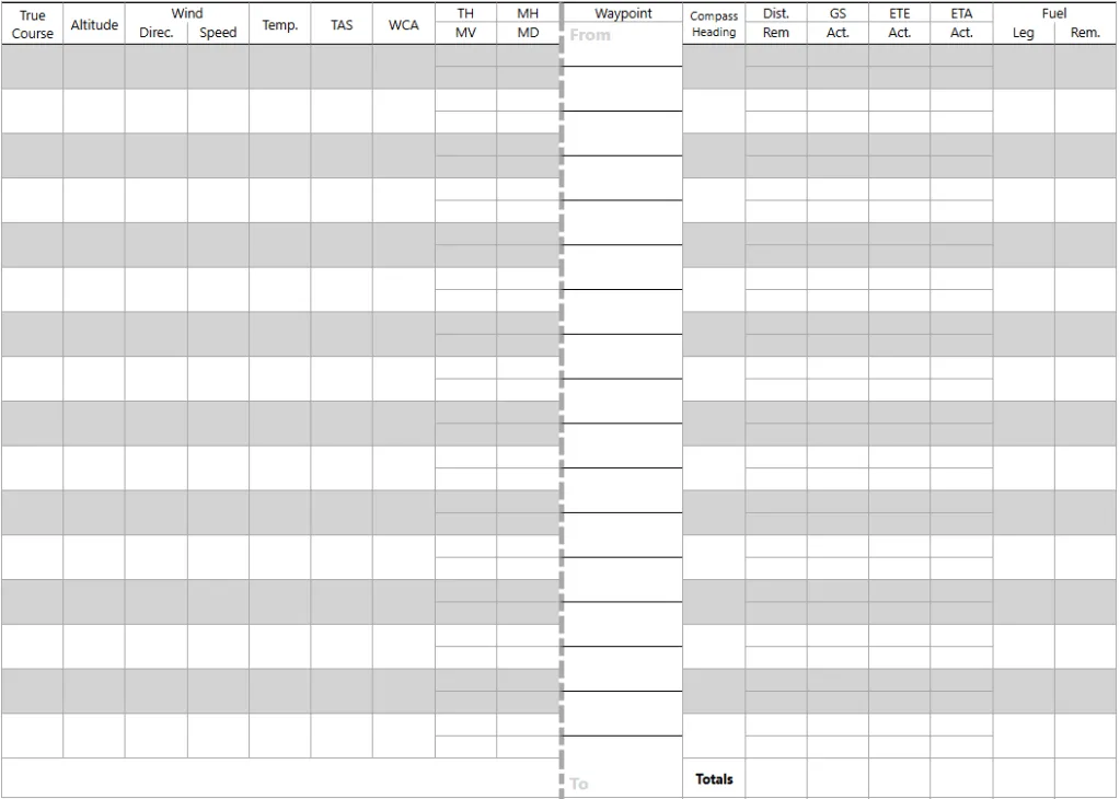 You can now print a paper Navlog template from either the new “Paper Navlog” demo or using “New Template > Full Page > Paper Navlog”. This template is meant to be filled manually as a preparation to your PPL cross country flights. If you have doubts about any column, mouse over in the application to view a brief description. The printed template can be folded along the dashed line to clip nicely on your kneeboard. The real estate has been optimized to allow up to 16 waypoints.