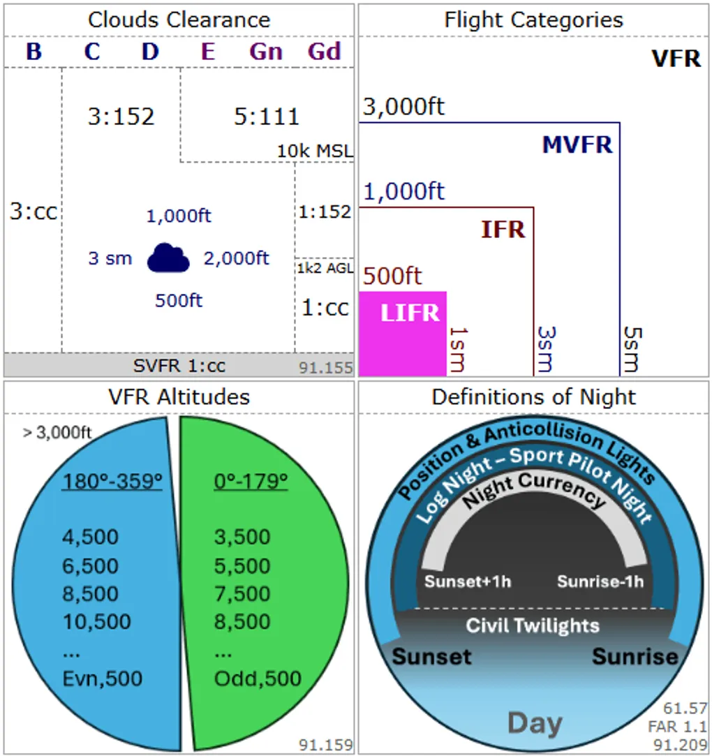 Reference tiles such as “Cloud Clearance”, “VFR Altitudes”, “Definitions of night” are now showing the associated regulation in the bottom right corner. If you mouse over the regulation number, you will see the regulation name. If you click it, you will be taken to eCFR.gov with the actual regulation text.