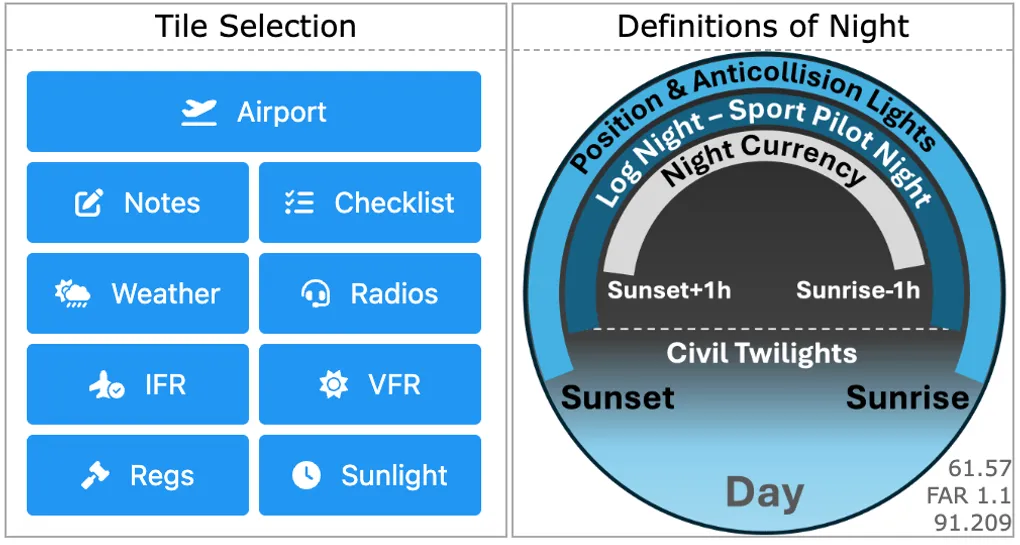 You can now select the regulations tile from the list which currently shows Supplemental Oxygen (91.211) and Definitions of Night, which is shared with the Sunlight tile.