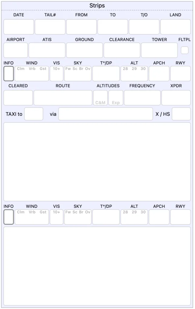 You can now pick a new ‘Flight’ strip type for your strip pages. It will allow you to track Date, Tail#, From, To, T/O time and Landing Time (see top line below)