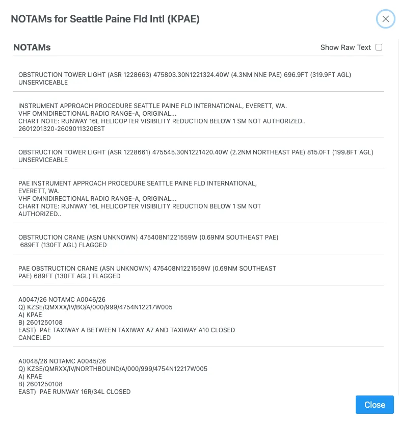 Format Options: You can toggle between Translated (plain text) for a quick overview or Raw format to view the original FAA telemetry.