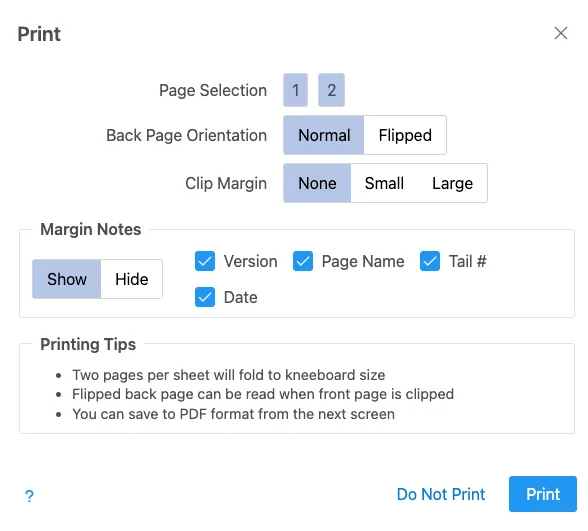 Prints are now hiding NOTAMs and METAR badges to reduce clutter, and avoid stale information. Further, the former “Vertical Info Bar” is now called “Margin Notes” and gives you more control in the print popup