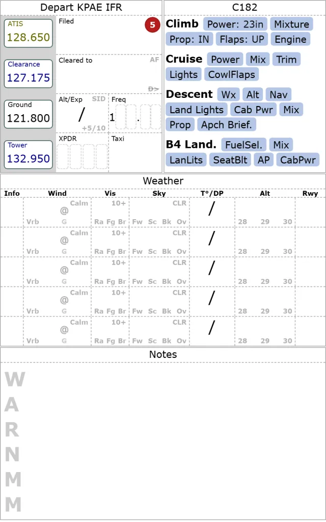 4. Clearances (Physical: Paper Kneeboard) As soon as the radio work begins, the paper kneeboard takes over. It lists all my frequencies of interest in order of execution—a massive brain-cycle saver. When I copy the ATIS or copy an IFR clearance, it goes straight onto paper. When I make that ground call, my eyes are on the kneeboard, reading the exact information I just wrote down.