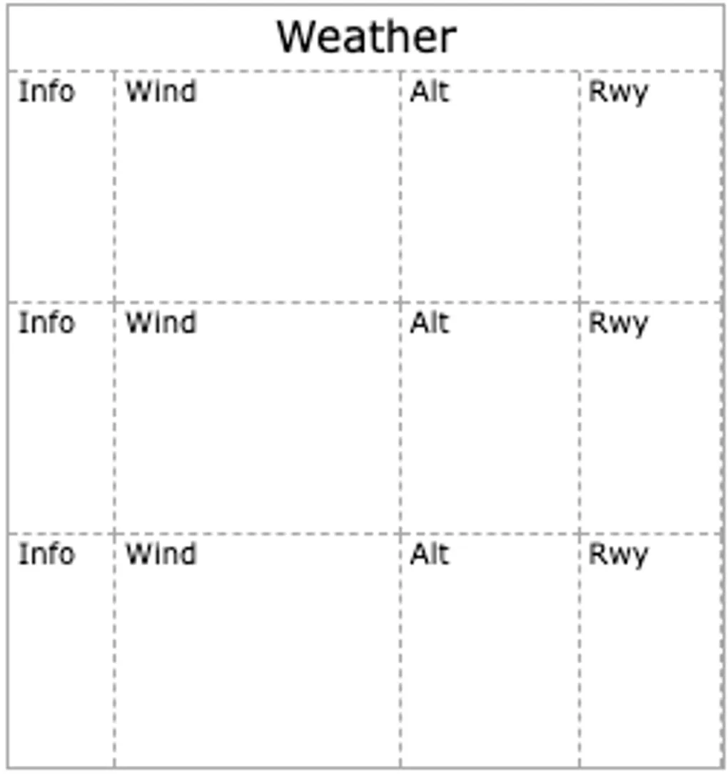 The Weather Tile uses faded placeholder text as a background guide (@, G, Vrb, SM, string dividers, etc.). While these watermarks help keep your notes organized, many pilots prefer a blank slate to write over without visual clutter.