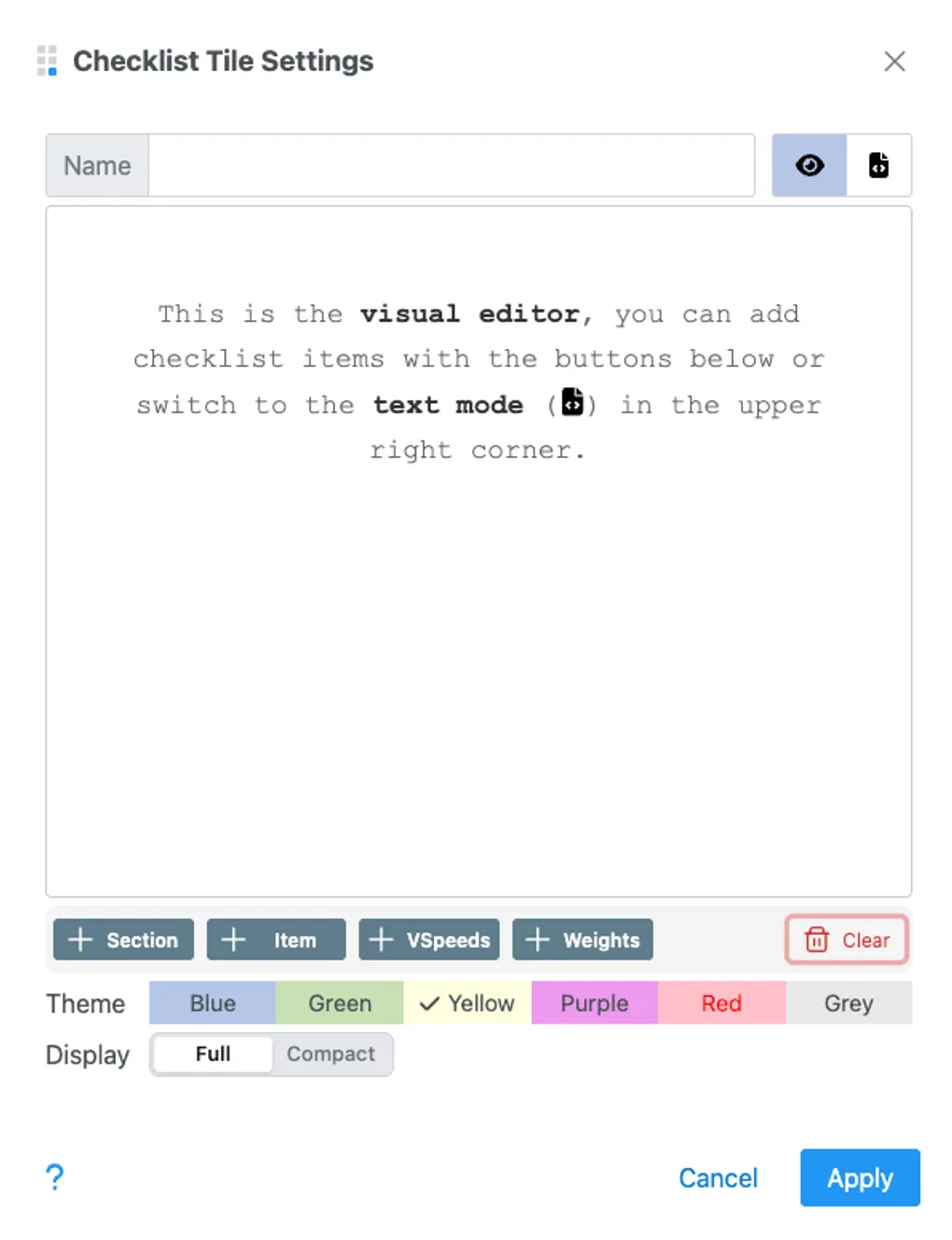 The +VSpeeds button in the checklist editor automatically populates Vs0, Vs1, and Vne based on your aircraft data.